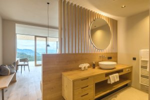 Das Panorama-Eckzimmer Dolomites ist ein wunderschönes Zimmer im Chalet mit einzigartigem Panorama Rundum-Balkon und großem Panoramafenster, helles Bad mit Regendusche, Föhn separates Wc, Bidet,